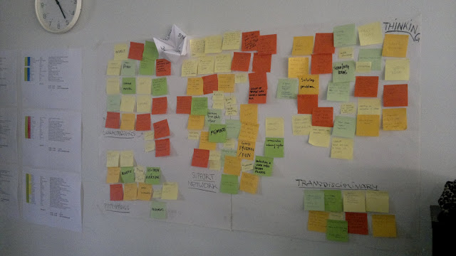中場午餐休息過後,A老師就開始作brainstorming。大家覺得要怎麼在設計工作上"Collectively" 地進行?其實一開始我不太瞭解"Collectively"這個詞到底是啥意思,但是照著老師一步一步拉著我們作Brain storming,我開始猜想這跟Participatory design是有關係的吧?