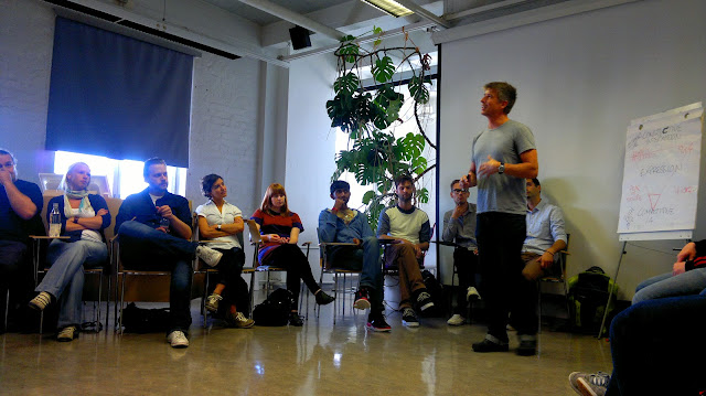 主講人是一個芬蘭演員,他是那種專演沒劇本表演的狠角色。整整三個小時的workshop,雖然主題是繞著有點嚴肅的expression/interactive action打轉,但幾乎有一半以上的時間,他帶著教室裡面的所有學生跳來跳去玩大風吹,有點像是在上戲劇學院的表演課。