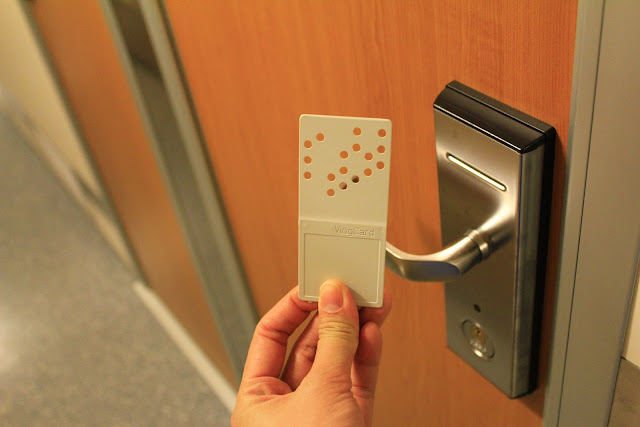 房間是門卡式的,進去之前房間門是打開的,門卡會直接插在房間門上讓乘客取用。