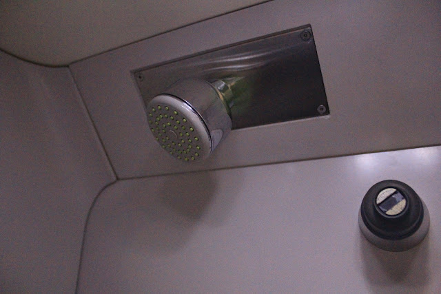 提過刷牙,那洗澡呢?雖說是公共浴室,可也是真讓人吃驚的一項車上服務啊。前面提到的黑色卡片就是用來洗香香的"key"! 帶著他去開浴室門吧!