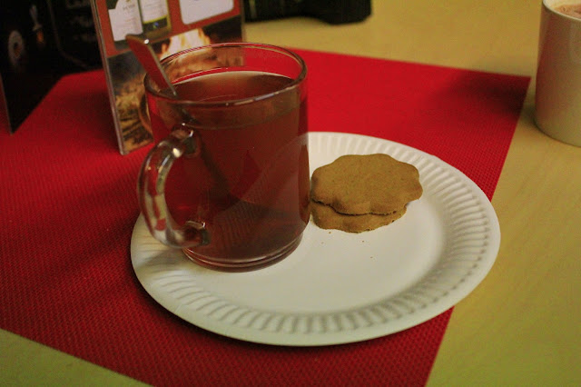 終於挨到聖誕老公公開門接客的時間。從河邊走到人山人海的Shuttle bus站牌,用力擠啊推的挨上了巴士,單程約二十分鐘車程的來回車票要價七歐,算"便宜"。火車晃呀晃地沒讓潔西小姐睡好,血壓低又被冷風吹得直發抖,下了巴士就直奔嘎逼店,先點一杯熱熱的Glogg暖暖身體,聖誕節嘛,應景應景。