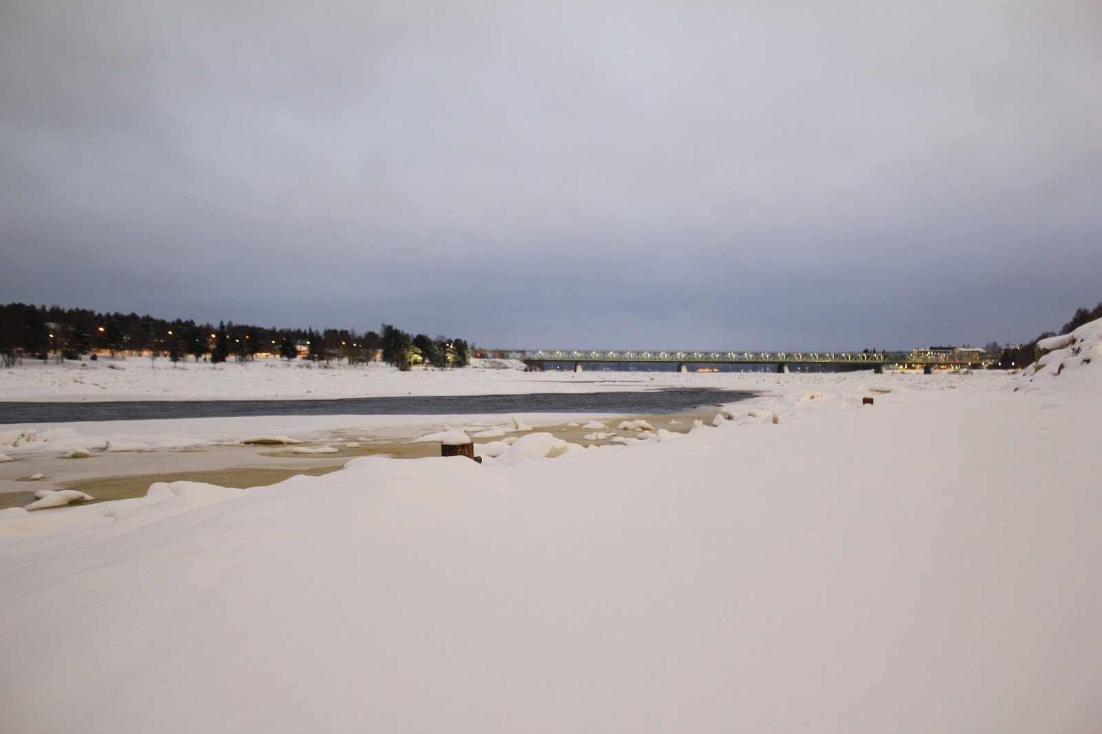 北極圈剛剛好壓過這個小鎮的頭頂,站在河上面望向遠方,竟然也有那麼一點點像Umea,從河口的方向望向學校。