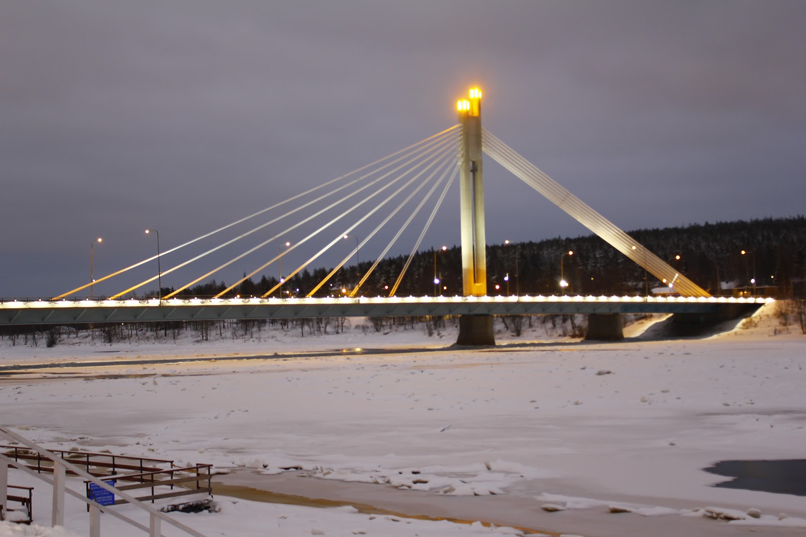 從火車站走到市中心大概就兩公里多一些,半個小時就能橫越整個城鎮。星期天一大清早的什麼店都沒開,只好晃啊晃,不小心就晃到河邊去了。結果就發現了這座跟Umea大橋長得一模模一樣樣的斜張橋。該不會是每個北邊城市都有一座吧?