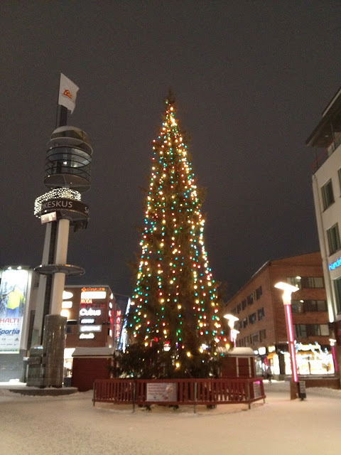 是說,Rovaniemi跟Umea一樣,市中心就那麼一條大街,主要靠著學生帶來活力的超級小鎮,而且更小,只有六萬人哈。但這裡卻又多了聖誕老公公的加持,所以觀光客的熱情在漫長的冬日假期裡面的確幫小城帶來不少錢潮活力。市中心裡有著很應景的特大號聖誕樹,不過在清晨冷清的街道上顯得有些孤單。