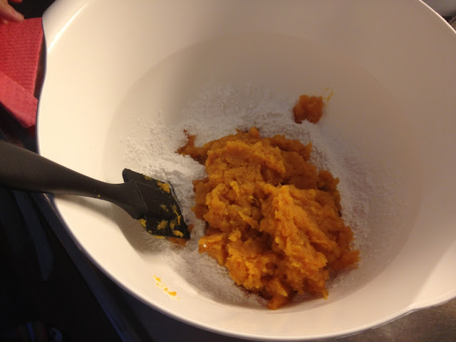 把地瓜壓碎,和糖拌勻。