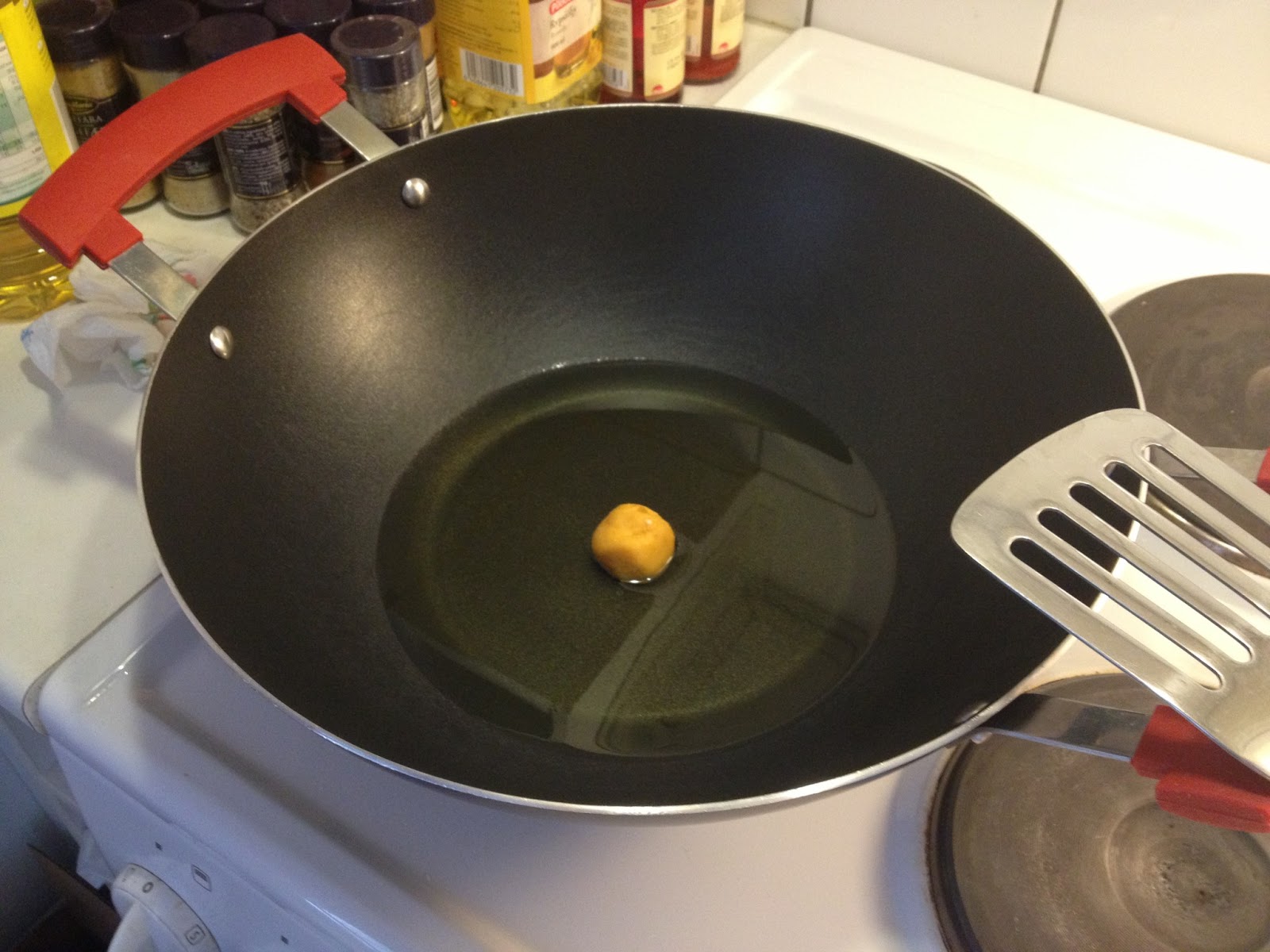 然後開中火熱油。這時候就要先丟一顆地瓜球下去,等他旁邊開始冒泡泡,就可以轉中小火(電爐大概是四),然後把剩下的地瓜球丟進去炸。