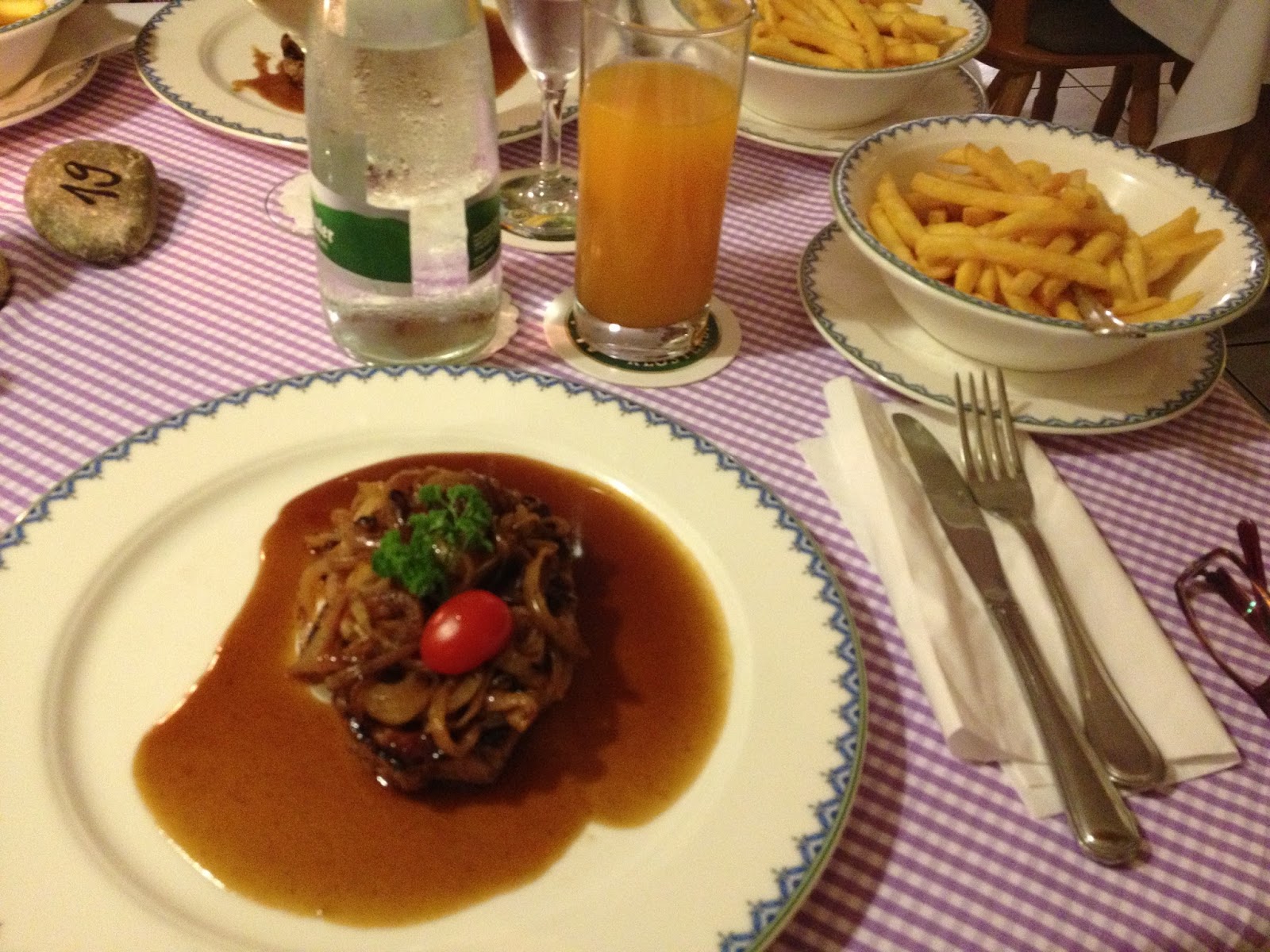 但是入口之後,哇!原來奶油炒洋蔥可以弄得這麼好吃,入口即化。而且醬汁去油解膩,配上油花均勻的豬排,整個就是讓人回味無窮啊。不過史瓦本人吃肉的功力真的是太厲害。這塊豬排掃完,大家還可以把薯條也清乾淨。我呢,掃完豬排之後就已經飽到要滿出來了。