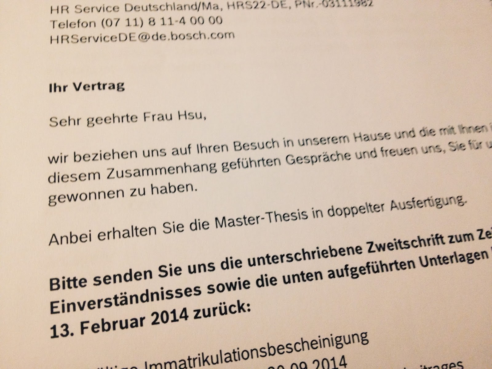 昨天拿到Bosch的Master thesis職位了,當初怎麼也沒想到這樣好的事情會發生在我身上。一個半路出家當設計師的人,說是已經練成個狠角色嗎,好像也沒有。但是我手上最充分的籌碼就是滿腔熱血(?),所以Bosch才會收我吧。